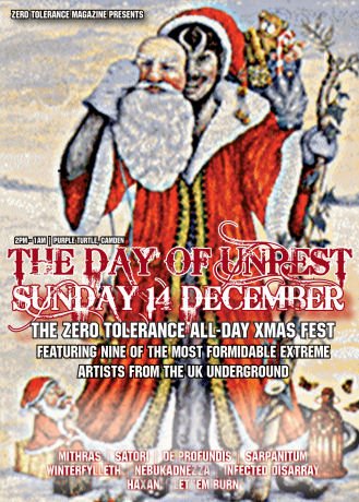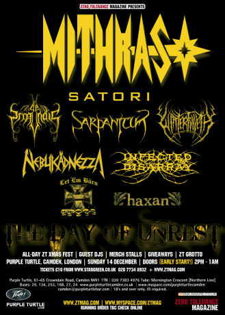 They were actually appearing with eight other bands at “The Day of Unrest”, the “Zero Tolerance All-Day Xmas Fest”, at the Purple Turtle in Camden on Sunday 14 December. Zero Tolerance is a metal magazine published by Mithras’ guitarist and his wife.