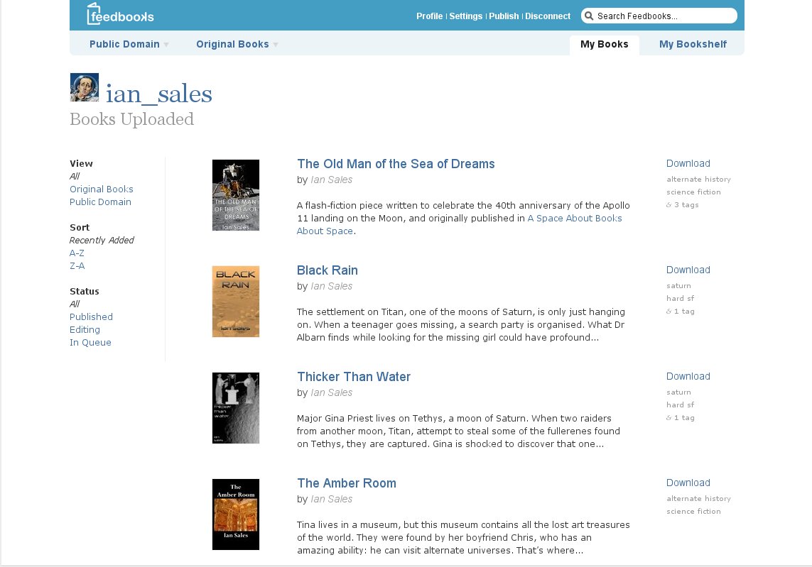 While I published my stories on feedbooks.com more as an intellectual exercise than as a serious self-publishing strategy, I’m happy with the results. I’ll to continue to re-publish my fiction there – a suitable length of time after each story was initially published, naturally.