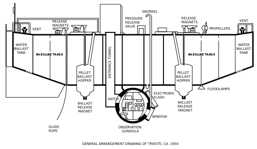 Seven Miles Down by Jacques Piccard and Robert S Dietz is the only book written specifically about the Trieste and its descent into Challenger Deep. The Trieste was invented by Piccard’s father, Swiss professor Auguste Piccard, who was apparently the inspiration for Hergé’s Professor Calculus. Piccard senior was one of those scientist-inventors who no longer seem to exist. In the 1930s, he built a balloon with a pressurised gondola, and ascended into the stratosphere, the first person to ever do so. A decade later, he turned his attention in the opposite direction, and invented the bathyscaphe, or “deep boat”, in order to study the depths of the ocean. It operates much as a balloon does, although using gasoline, which is lighter than water, rather than air. His first such vessel was the FNRS-2, named for the Belgian Fonds National de la Recherche Scientifique, which financed its construction and early operations. It was later sold to the French Navy, who upgraded it to the FNRS-3. The Trieste, however, was privately funded.