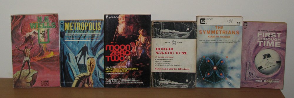 Some more for the British SF Masterworks reading list: Rex Gordon, Kenneth Harker and Charles Eric Maine. I bought Metropolis because I’d not known it had been novelised. The Wells, The World Set Free, amused me as the back-cover blurb praises Wells’ accuracy in predicting the future… including the nuclear war in 1956. Moon Zero Two… well, I like reading novels about pre-Apollo Moon landings.