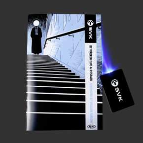 SVK, Warren Ellis and d’Israeli (2011), was sold on a gimmick: it requires a black light torch (packaged with the comic) to read some of the speech balloons. It is otherwise a fairly typical Ellis sf piece, with a nice twist in the end. A freelance fixer is called in by a government department to recover a piece of technology, which, it transpires, allows a person to read the thoughts of other people (and it’s those which are printed in invisible ink). D’Israeli’s art is good, Ellis’ dialogue is also good, but it all feels a little thin and a bit overwhelmed by the invisible ink gimmick.