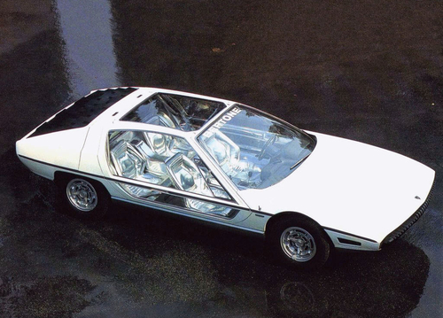 In the future, all drivers will wear crash helmets and skintight clothing: Alfa Romeo Carabo, 1968 (Bertone)