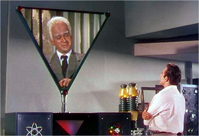 The first half of the film more or less follows that of the book. Cal Meacham is a manly electronics engineer in California. When an order for parts for a project goes awry and he receives instead some devices which are decades ahead of what he is expecting, his curiosity is piqued. He orders a catalogue, and from it he then orders the parts necessary to build an “interociter”. Without actually knowing what an interociter does. The bits are delivered, he figures out how to put them together… and it’s a communications device. Which is promptly used by someone to offer him a job as he has “passed the test”.