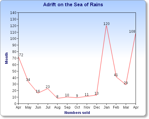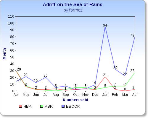 Adrift on the Sea of Rains continues to sell well on Kindle – better in the UK than in the US, it must be said. The number of Amazon paperback orders has also picked up, typically now around one a week. Of course, I’d sooner those sales took place on the Whippleshield website, but I know of no way to drive customers there from Amazon. When I mentioned in a previous blog post that Kindle sales were “more or less pure profit”, someone on a forum responded: “I had to laugh at this one. Shows a real lack of understanding of the costs involved in running a successful website. Electronic files take up disk space which has to be paid for. The transfer of electronic files uses bandwidth that has to be paid for”. To which I can only say, if you’re paying for storage of a single electronic copy of your book, and can actually work out the cost of uploading that file to Amazon, then I suspect other people are laughing at you.