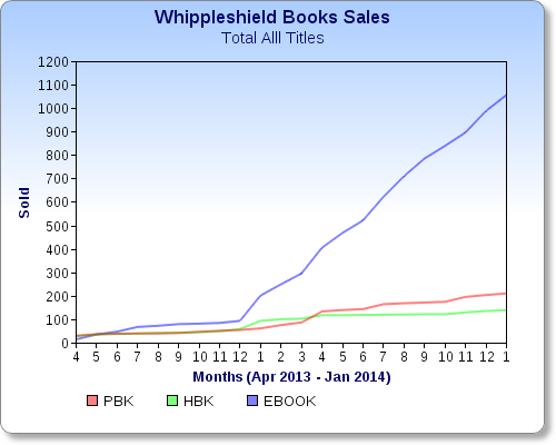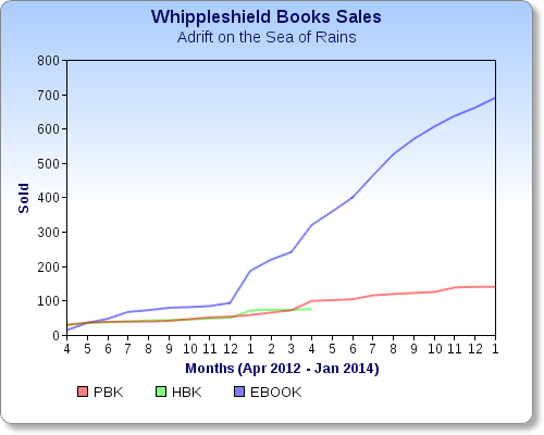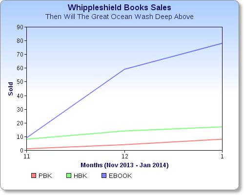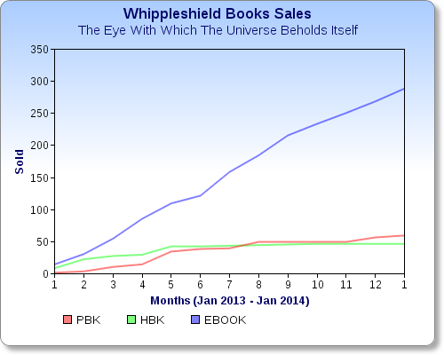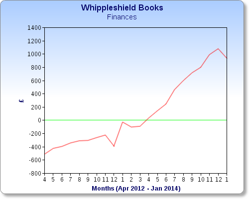The two dips at the end of 2012 were a result of the invoices from the printers for The Eye With Which The Universe Beholds Itself. Ebook sales were robust throughout 2013 and the dip at the end of the year is the printing costs for Then Will The Great Ocean Wash Deep Above. (The only fixed costs for Whippleshield Books are the annual fee of £143.86 for the ecommerce website and the purchase of ISBNs at £118.68 for ten (each title uses three, one for each edition).)