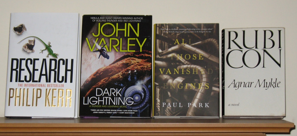 Some new first editions and an old one. Research is Philip Kerr’s latest, and about a James Patterson-like writer who’s framed for the murder of his wife. Let’s hope it’s not a James Patterson-like book… Dark Lightning is the fourth in Varley’s Thunder and Lightning series, following on from Red Thunder, Red Lightning and Rolling Thunder. I initially thought these were YA, but I don’t think they actually are. All Those Vanished Engines is a new novel by a favourite writer, and the first from him since the Princess of Roumania quartet back in 2005 – 2008. I am excited about this book. Finally, Rubicon by Agnar Mykle is one by mother found for me. I looked it up and it sounded interesting so she got it for me. Mykle seems to be Norway’s answer to DH Lawrence – his Sangen om den røde rubin (1956, The Song of the Red Ruby) was confiscated as immoral and obscene. Rubicon is the third book in a loose trilogy begun with The Song of the Red Ruby. If Rubicon is any good, I might track down Mykle’s other works.