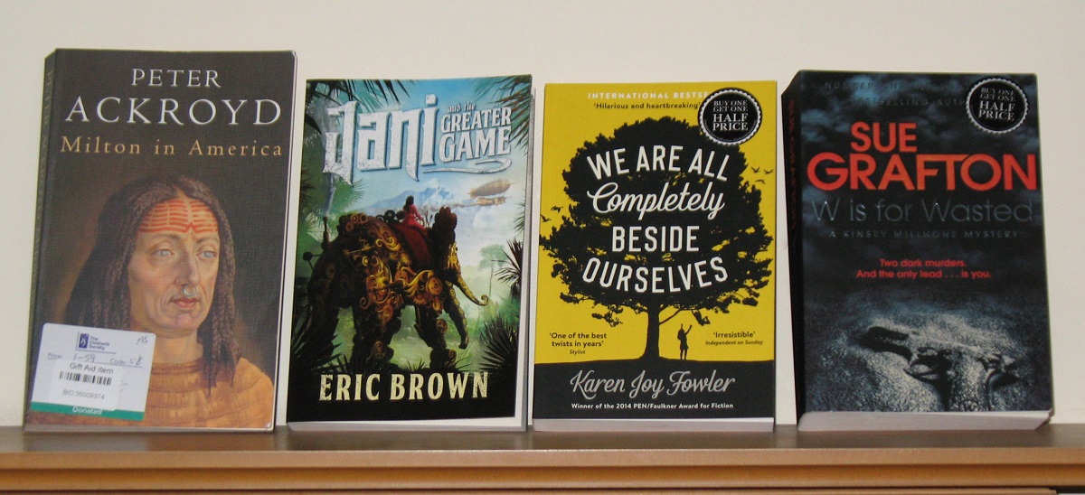 Some recent paperback purchases: We Are All Completely Beside Ourselves I bought because Karen Joy Fowler. I’ve been following Kinsey Millhone’s career for a couple of decades and W is for Wasted is the most recent installment. Grafton has kept the series’ internal chronology consistent, which means this one is actually set in 1988. Which sort of makes it historical crime fiction. Milton In America was a charity shop find. And Eric sent me a copy of his latest, a steampunk set in India, Jani and the Greater Game.