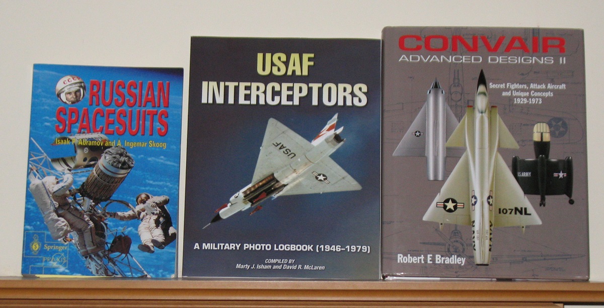 More books for the aviation collection. USAF Interceptors is a collection of black and white photos of, er, interceptor jet aircraft from the Cold War. Not as useful as I’d hoped. Convair Advanced Designs II is the follow-on volume to, um, Convair Advanced Designs, this time focusing on fighters and attack aircraft. And for the space books collection, Russian Spacesuits, which I used for research for my Gagarin on Mars story – and will likely use again at some point.