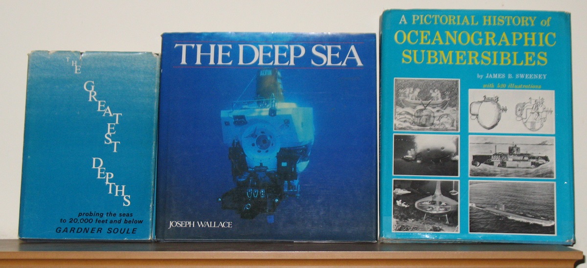 Finally, more books for the underwater collection. The Greatest Depths by Gardner Soule is a quick and not especially, er, deep study of underwater exploration and exploitation. It covers the main points, including the Trieste’s descent to Challenger Deep and the Ben Franklin’s journey along the Gulf Stream. A Pictorial History of Oceanographic Submersibles does exactly what it says on the cover. It was cheap on eBay (although I demanded, and received, a partial refund because it turned out to be a bit tatty). And The Deep Sea is a glossy coffee-table book containing some nice photos of things at the bottom of the sea.
