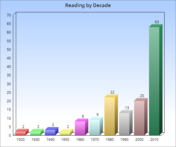 I also worked out my reading by nationality of the writer. I discounted anthologies, because while their contents could be from a single nation, many are not. I had expected the US to be the source for much of what I’d read, but it turned out to be the UK – 40% to the US’s 35%. I seem to recall the same happening last year. Next highest was Germany, with 4% (that’ll be those Jenny Erpenbeck books, then). Other nations include: Argentina, Canada, China, Denmark, Norway and Spain, among others.