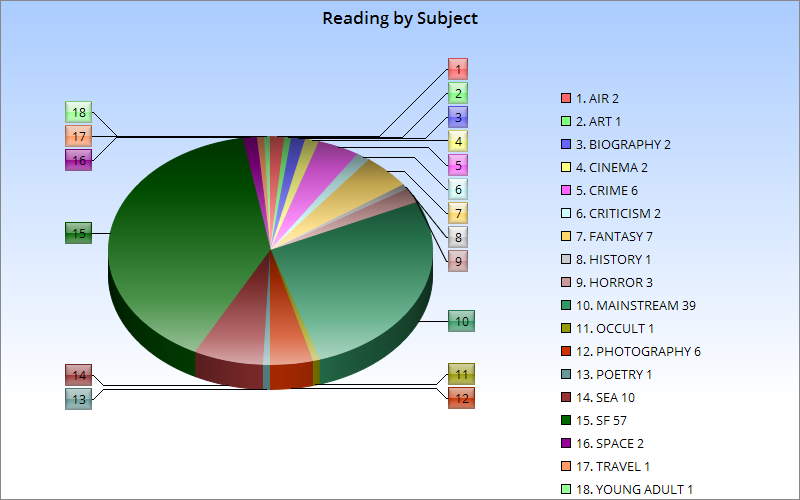 And subject-wise, science fiction still forms the majority of my reading, although it’s less than half at 40% (down from 47% last year). Mainstream takes second place at 27% (up from 23% last year). The single Young Adult title was from my reading of the underwhelming 2016 Clarke Award shortlist.