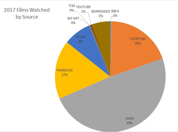 Nearly half of the films I watched were ones I owned. LoveFilm, which closed at the end of September, was the next biggest source; followed by Cinema Paradiso, another DVD rental service (and the only one left, I think). The only streaming service I have is Amazon Prime, which throws up the occasional good film. I might subscribe to MUBI or Curzon in 2018. I haven’t decided yet. There are a couple of Netflix TV series I’d like to see but I’m not sure if they’re worth paying the subscription. Annoyingly, Amazon are apparently dropping the Youtube app from their service – too much of a competitor for out-of-copyright material, I guess. Monoplistic bastards.