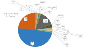 In 2016, I started to track the country of origin of the writers I read, and was surprised how much of my reading is by UK writers. That apparently hasn’t changed – although it has risen from 39% to 49% (and the US has dropped from 35% to 24%). But in 2017, I read further afield – twenty countries compared to seventeen. And some of 2017’s countries were new to me: Albania, Belarus, Bangladesh, Estonia and Norway. Several years ago, I challenged myself to read a book each month from a different country, but I got bogged down in an Orhan Pamuk novel and never finished it. I might have another go at the challenge in 2018.