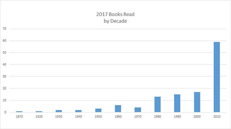 Despite my comment above – and yes, there are books that have sat on my shelves for more than a decade before I finally got around to reading them – it always surprises me to learn the bulk of my reading is from the current decade. I don’t actively seek out the New Shiny – often, I avoid it. So that’s a bit weird. The 1920s and 1930s are probably due to some DH Lawrence I read. The 1870s was, I think, a couple of Jules Verne books.
