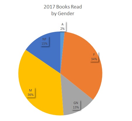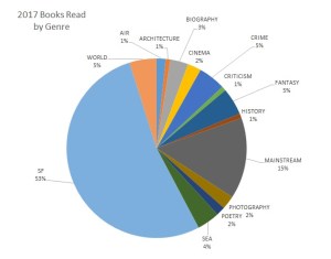 I’ve yet to work out if I’m still a science fiction fan – I mean, I write it, and I still read it, but I have a low opinion of much of the genre’s output. And then I tot up the books read by genre at the end of the year, and it seems science fiction forms almost half of my reading. So I guess I must still be a sf fan. My mainstream reading is down too – even if you add in “world” (which would be translated non-genre fiction), it’s still less than last year’s 27%. Checking back, my sf reading was 40% last year… but I’ve no idea why I read so much more sf in 2017. Was it a good year for science fiction? Not that I read novels as soon as they’re published all that often – sometimes it can take me up to a decade to get around to reading a book I bought when it was first published. I don’t know. There were several sf novellas published in 2017 by writers whose fiction I like. Perhaps that accounts for it.