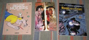 Inside Moebius, Part 1, Moebius (2004, France). I came to Moebius’s work from Jodorwosky, as Moebius – Jean Giraud – illustrated Jodorowsky’s Incal series, still one of the greatest sf bandes dessinées of all time. Although, having said that, I seem to remember seeing parts of Moebius’s Airtight Garage many. many years ago. Back in the early 1980s, I used to fly out to the Middle East for holidays via Schiphol Airport, and in the bookshop there I would often pick up a copy of Heavy Metal or Epic, and even an issue of 1984 (which I had to hide once I’d discovered what it contained). I’ve a feeling that’s where I first encountered Moebius’s work. That’s all by the bye. I’ve been a fan of Moebius for many years now, so I keep an eye open for when new stuff by him appears in English (I could, I suppose, buy the original French editions, but I have enough trouble keeping track of new stuff in one language market, never mind doing it in two). Inside Moebius, originally published in in six volumes in France but now as three volumes from Dark Horse, is a sort of autobiographical private project that blossomed. Moebius wanted to give up smoking, so he started writing a bande dessinée about it, and then sort of dragged in the books he had worked on, or was currently working on, and his thoughts on a variety of subjects. Particularly politics. Osama bin Laden makes an appearance in Inside Moebius, Part 1, as do some of Moebius’s characters – Blueberry, Arzak and the Major. The art is not as detailed as in other Moebius works, it’s almost sketches, in fact. But the way the book is designed, it’s clear the words are more important. The dialogue is full of puns, many of which have not translated but a helpful afterword explains them. (For the record, I did get the “Fumetti” one.) It’s all good stuff, although I could have wished for artwork as good as that in the aforementioned works.