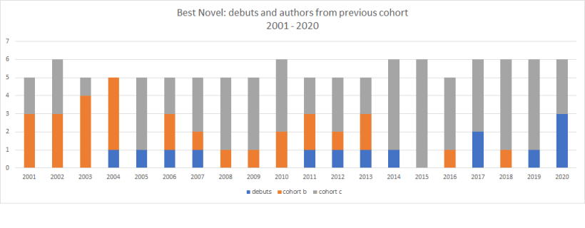 Again, there’s overlap from the preceding cohort, and it too takes around fifteen years to fade away. But debuts are also clearly more popular, appearing on the shortlists of eleven of the twenty years, and even making up half of the shortlist in 2020. On the other hand, the one debut novel on the 2004 shortlist was Charles Stross’s Singularity Sky – and he was then nominated each year for further five years. The debut novels nominated in 2011, 2012, 2013 and 2014 were by, respectively, NK Jemisin, James SA Corey (technically not a debut as one of the two authors who write under that name had been previously published), Saladin Ahmed (who has published no novels since), and Ann Leckie. At least two novels I’d thought were debuts – by Paolo Bacigalupi and Yoon Ha Lee – proved not to be, as both had published collections earlier.