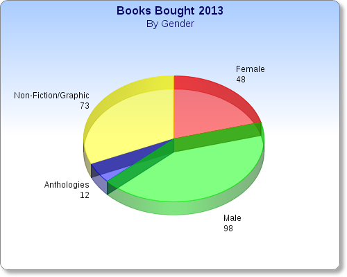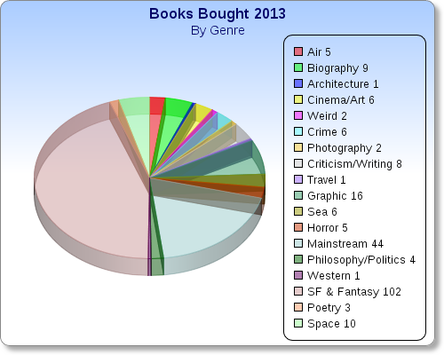 In 2013, I bought, was given, or was sent for review 231 books. I read only 72 of them (but some purchases were actually first editions, or better copies, of books I’d read previously, so I’ve counted them as read). So that’s a net gain on the To Be Read massif of 78 books… which is not the proper way to do it. I should be buying less books than I read. By genre, my book purchases break down as follows:
