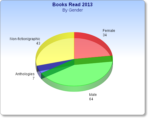 In 2013, I read a total of 148 books, which is slightly down on my previous year’s total of 153. In fact, the number of books I read in a year has been dropping steadily each year since 2008’s high of 220. There are actually a few books I dipped into for research, but since I didn’t actually read them, I didn’t record them as read. The books I read in 2013 break down by genre as follows: