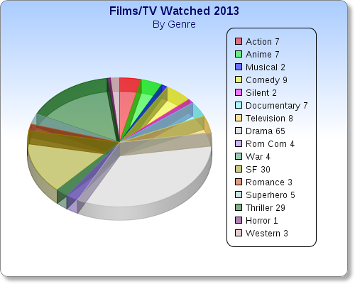 In 2012, I watched 180 films and 8 seasons of television programmes. Of those, 142 were for the first time and 44 were re-watches. These charts don’t include those television series I watched which were broadcast, only those I watched on DVD. By genre, they break down as: