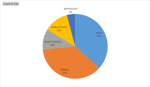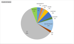 Geographically, the preponderance of science fiction means it’s no real surprise most of the books I read were from the US (44%), closely followed by the UK (38%). The next highest were France and Sweden, with around a half a dozen books each. I also read books from Australia, Canada, Denmark, Finland, Germany, India, Iraq, Ireland, New Zealand, South Korea and Spain.
