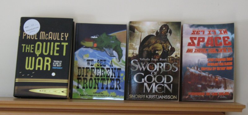 Last year, I bought a copy of The Quiet War on eBay because the seller said it was the hardback edition. It wasn’t, it was a trade paperback. I complained and received a partial refund. Earlier this year, I read the book… and I had problems with it. And then this month, I found this hardback copy of it in a local charity shop. So of course I bought it. Bargain. We See A Different Frontier is a collection of postcolonial genre stories. Swords of Good Men I have to review for Interzone. Fantasy, meh; but… Vikings. Set it in Space and Shovel Coal into it is the second anthology by the Sheffield Science Fiction and Fantasy Writers Group, and the introduction is by Yours Truly.