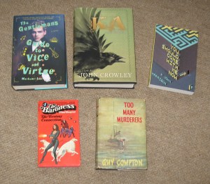 A mix of old and new for the collection. John Crowley and M John Harrison are writers whose works I much admire, so Ka: Dar Oakley in the Ruin of Ymr and You Should Come With Me Now were books I’d been looking forward to. The Gentleman’s Guide of Vice and Virtue I picked up after a conversation with Jeannette Ng at Sledge-lit. I’m not convinced it’s my thing, but we’ll see. Too Many Murderers is DG Compton in his first incarnation as a crime writer. These books are really hard to find, especially with dustjackets. And The Baroness #1: The Ecstasy Connection… I stumbled across mention of the book somewhere, and it sounded really trashy and dated, so hey why not? And no, I paid nowhere near the price asked for Amazon.